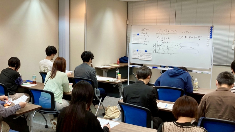二時間の勉強会の中で、作曲を円滑に進めるための音楽理論を初級部分から学び、「それらをどう作曲に活用していくのか?」というところにつなげながら理解を深めていきます。